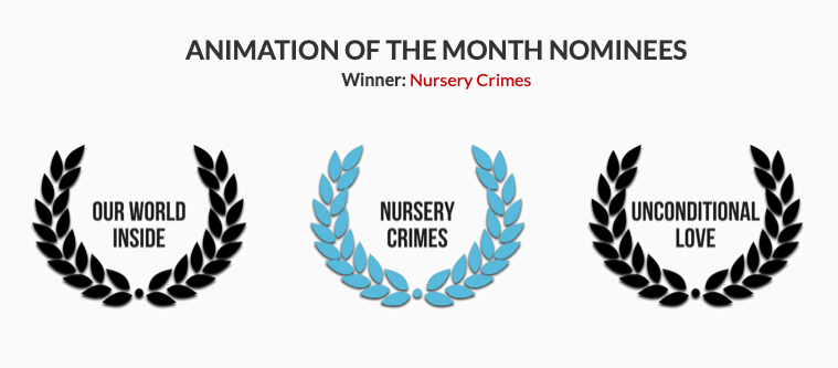 Flashing forward to 2022, I gave TMFF another go at the end of April with “Nursery Crimes Part One: The Ominous Overture” and couldn’t believe what happened transpired over the course of the next 31 days. Not only was my short film selected this time around, it was also an “Animation of the Month” nominee along with two other animated films and ultimately won for May 2022! I consider this particular development a valuable lesson in perseverance and how it can pay off when one least expects it.